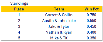 | 4 | Tyler | 4.0 | 2-1 | 2.0 | 398.16 |