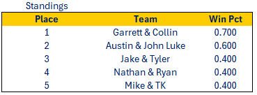 | 4 | Garrett | 5.0 | 3-2 | 2.0 | 652.22 |