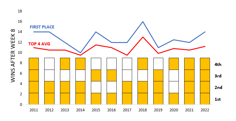 So what's to take away from this? Well for starters, if you're currently in the top 4 of the standings, you historically have juussstttt under a 50% chance of making the playoffs at this point. If you're in the top 2 you're almost guaranteed, only three times ever (12.5% of the time) has a team in 1st or 2nd after week 8 not made the playoffs: