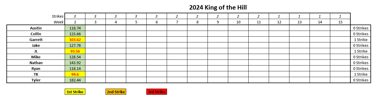 This marks the first week of our season long game, King of the Hill! For the first 5 iterations, there are 3 strikes allocated per week. Remember that its three strikes and you're out, so a strike this week doesn't ruin you, just puts you a smidge behind.