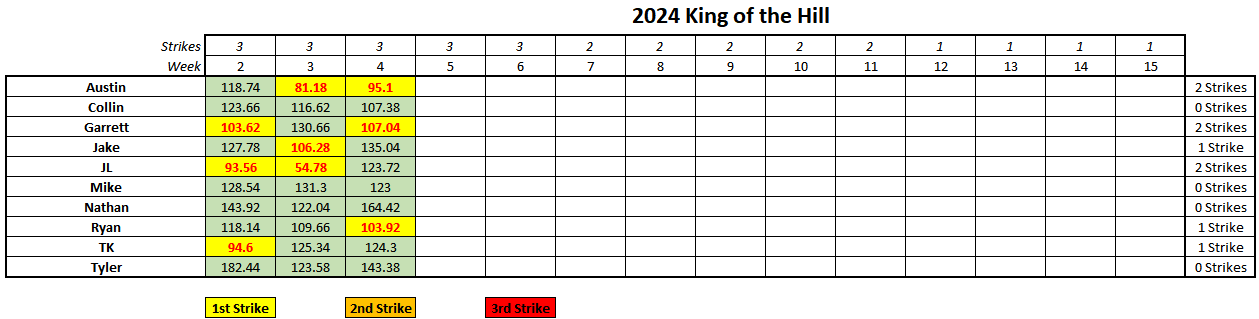 Parents in the group, get a pen and take notes. Publically and rudely berating someone for poor behavior WORKS. John Luke took his whips last week, turned around, and landed himself a Top5 and a weekly challenge. Now, he still lost, but putting up Zamir White as an RB1 against Tmo when he's getting 33 points from Nico Collins, 26 points from Jordan Mason, and another 20 from Kyren Williams? Yeah that's a losing battle. But look, for what JL was working this this week should be considered an absolute win. Tmo continues his death grip on the top spot, but he'll have a challenge next week against Collin, who sits at 5-3 and well within striking distance of first place. John Luke actually has the benefit of playing one of the only people that's actually been WORSE than him this year, Austin.
