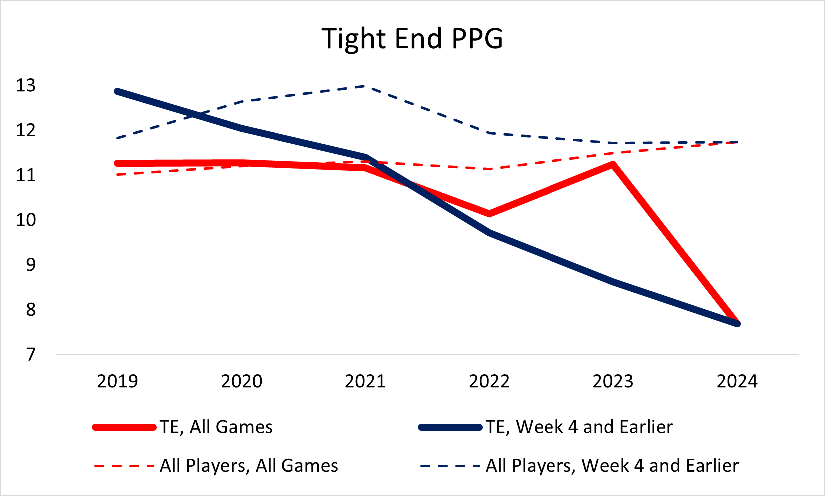 So what we have here is lines (obviously). The RED line is the average points scored per game from the TE position for the whole season. Pretty substantial drop off this year. BUT, the BLUE line is the same number, but only looking at games during the first four weeks of the season. I find this to be an interesting look, on the whole (except for this season so far) TE production has stayed pretty much the same every year. But consistently, the scores put up by TEs in the early games have been dropping. Logically, this means that TEs have been playing a proportionally larger role in games later in the season. But are the players as a WHOLE just scoring less, regardless of position? Well... no. The thin dotted lines are the average PPGs of all positions (red for all weeks, blue for week 4 and earlier). The average remains consistent, right around 11.5-12 per game.