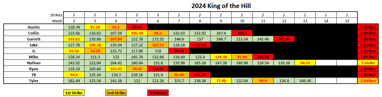 Man, when Mike had to clutch up and come through to stay alive, he just absolutely fell flat on his face. Breece Hall with 5, tsk tsk. You went negative on defense bro, like what are we doing. Ryan, it hasn't been your year, there's no denying that. But 140+ in what is essentially garbage time for your season is both honorable and sort of hilarious. As covered above, Mike isn't technically out yet, but he can go ahead and start planning 2025 draft strategies. Ryan can be an absolute menace and continue casuing standings issues with games against Nathan and Garrett to close out his season.