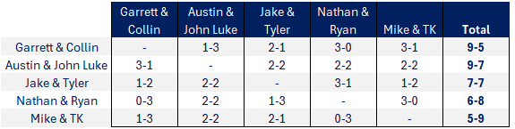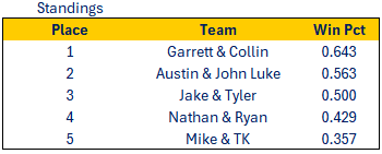 Not a ton of movement this week. Most of yall were playing partners, and JL/Austin and Jake/Tmo split thier series. We'd better not let Garrett and Collin run away with this...