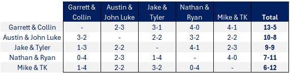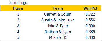 The 0.08 point loss may have broken TK this year. He falls to 2-8 in H2H matches on the year and, while he can't be eliminated from the playoffs this week, is staring that reality in the face in the near future. Brock Bowers (3.7) and Justin Jefferson (7.7) were two of TK's primary problem children, and even when Josh Allen pulls his weight sometimes its not enough. Garrett put up reasonable numbers, even though Saquon had a somewhat tame 13.1, and the win helps propel the Garrett-Collin coupling to a 3 game lead over JL and Austin with only 10 games to go. TK, it may be time to make a 2026 move my friend. Your pal Jake's door is always open.