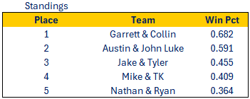 Jake/Tmo plays Garrett/Collin this week in what could be a massive 2-game gap closure if they can pull it off. Austin and John Luke now only sit 2 behind the lead as well, so if Collin and Garrett don't come through we could have an exciting finish after all! Nathan and Ryan are, officially, eliminated.