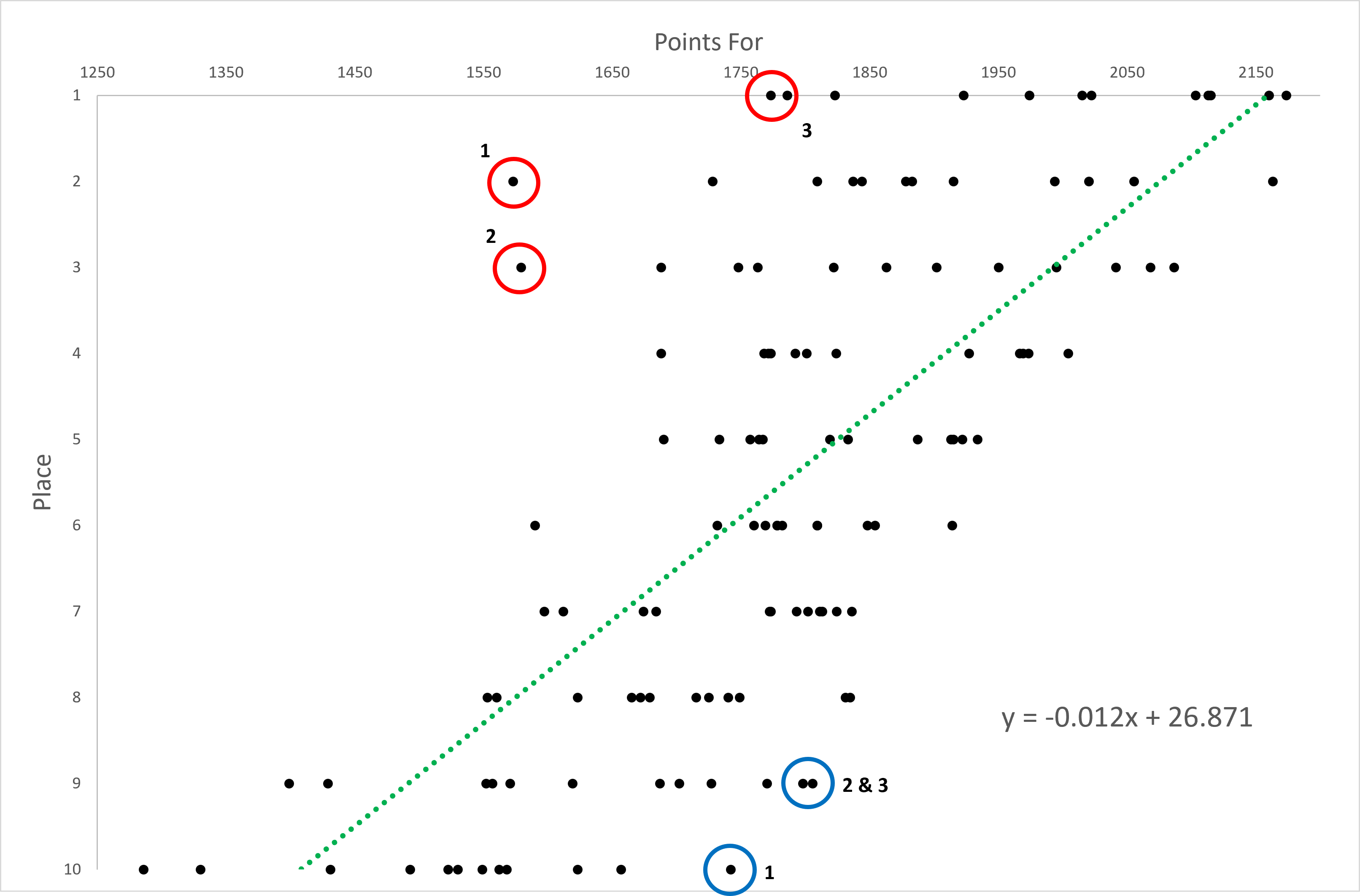 So basically, dots that are closer to the green line represent teams who's final season place was right what you'd expect based on how many points they scored, and they have a low DFEF. Dots that are way above the line placed much higher than they deserved, and vice versa. A team's DFEF was determined based on their actual finish minus the expected finish, calculated by the trend line formula displayed above. From that, I identified three times a team finished greater than 4.5 spots above their expected finish (red circles), and three times a team finished greater than 3.5 spots below their expected finish (blue circles).