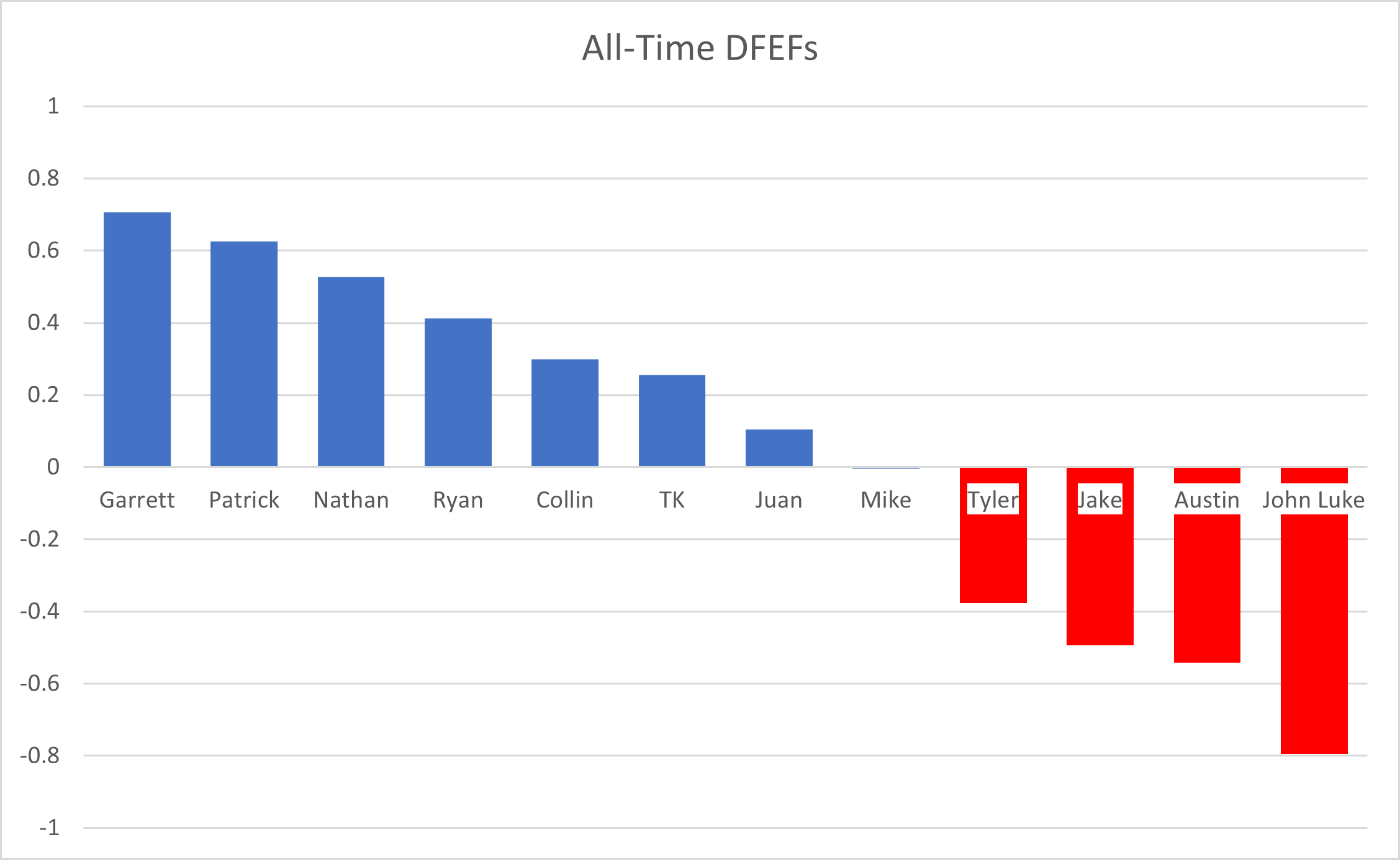 - Tyler, 2019: This is a situation where the statistic fails us. Tmo's DFEF this year was -4.6 in a year where he finished in 1st, but he also had the 2nd highest PPG in the league in 2019 behind Ryan. Because of that, I don't think it's fair to call him lucky for this one because the whole league was down on scoring in this season.