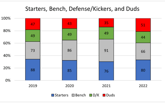 I trust you all know that I only want what's best for this league, so hear me out. I did some analysis of how much we've used the bench since 2019. I categorized players into four categories: Starters (defined as starting at least half the games in that season), Bench Players (defined as starting less than half the games in that season), Defenses/Kickers, and Duds (defined as being on a roster but never starting for that season). I looked at how many of each category have been on rosters.