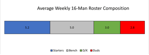 As displayed in the chart above, 78% of the starts come from Starters or Defense/Kickers, and only 22% from the Bench. Not only would reducing the bench to 6 improve waivers without sacrificing roster quality, it would also have a minimal impact on a team's actual starting lineup.