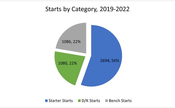 So, that's the roster itself, but what about who actually makes it to the starting lineup? There are 90 starts per week (9 per team), 1,350 (or 1,260 in 14-week seasons) per season.