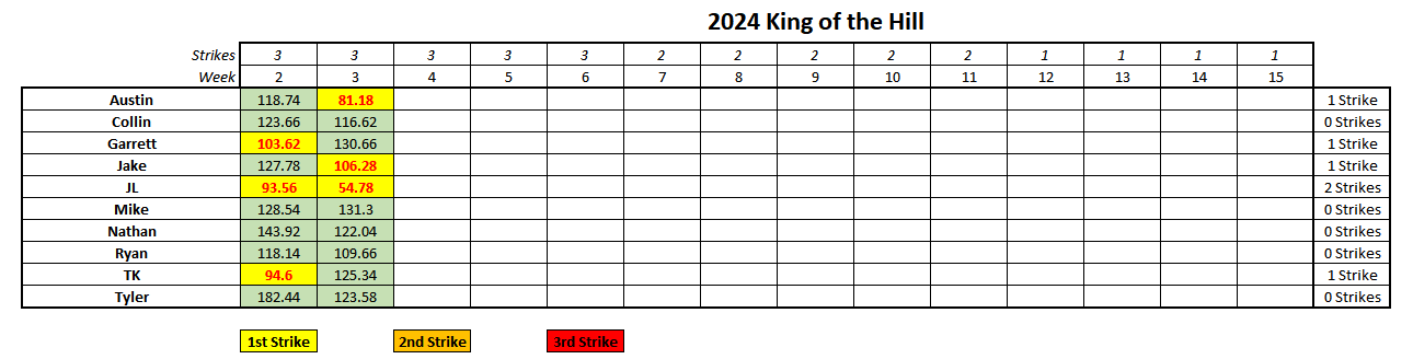 Nathan?? Secretly 4-2 and in the top 4 in scoring so far this year?? After 3 weeks are we seeing the seeds of playoff hopes planted?? It may depend on Jalen Hurts, who's honestly looked kinda shit this year, but Derrick Henry absolutely RAKING and Justin Jefferson delivering that Round 1 value, along with keeper Drake London putting up 18.7, that's a solid showing out there! Plus he's avoided the injury monster so far! Not gonna lie yall, if Nathan wins a championship before I do there's no telling what I would do in retaliation. May shut down the league, who knows. Collin, much like Jake, stumbled after the perfect start to sit in the 4-2 club as well, but he's still got a scary lineup and the hiccup is no reason to worry. Both Collin and Nathan face off against bottom-4 teams this week, so look for them to keep pressure on the league leaders. Fun fact, both of these teams doubled up John Luke this week.