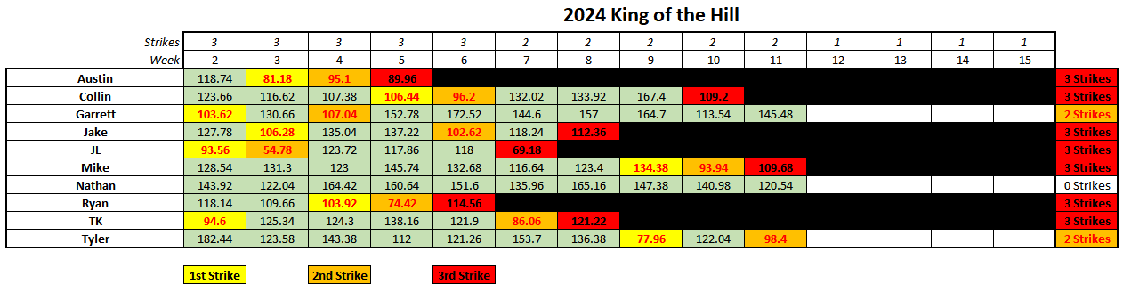 A few key points to pay attention to here. One, Mike is out and Tyler is on the brink with two strikes. Two, Garrett has had two strikes since Week 3 and has held on so far. Three, Nathan remains clean, and if he fumbles this bag he doesn't deserve a playoff run. Four and finally, there will be only one strike per week moving forward. Would love to see this go all the way to Week 15 but TBD if yall can make that happen.