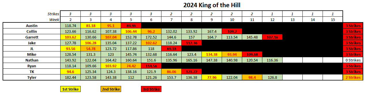 Austin bro HOW did you lose this game? You would have been eliminated anyways, but you made it way more freaking complicated for me to sort though all the tiebreaker shit with Mike included. Classic Austin dude. This man had TWO 30+ point games from Mahomes and Josh Jacobs, 20 more from Puka, and went into MNF down less than 3 points with a whole WR left to play. Quentin Johnston got Z-E-R-O points. He even had 5 targets and didn't manage to catch a single one. So not only did Mike get the Top 5 point, he also escaped with a win, propelling him to 13-11 and just 1 point out of a playoff spot with Ryan due up. Austin's last source of inspiration for the season will be to play spoiler for TK and Jake, which knowing how the universe works he almost certainly will for Jake.