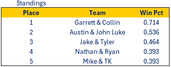 The idea is simple, its a little "league within a league" where everyone has a partner, and there's a competition between partner pairs. If someone in the pair beats a someone from outside the pair, their "team" will get a win ("Gut Check" week will NOT count for this game). Each group will have 26 total games (partners will still play each other once, no special scheduling changes for this), and the best record wins. The $150 will be split between the winning pair. See below for an example of how it could have worked last year.