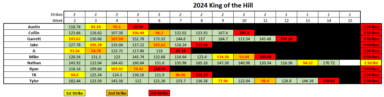 Like everything else on this page, I stole this one, this time from a guy that posted on /r/FFCommish. It’s sort of like Survivor from 2022 and Imperialism from 2023, in that its season-long game that updates weekly. Every week a certain number of “strikes” are given to the lowest scoring players left in the game (that number is in the “Strikes” row). Once you get three strikes, you’re out. We will start ours in Week 2 to give everyone a chance to get their wits about them, and this will be the Week 15 Challenge, regardless of when someone is actually crowned the winner.